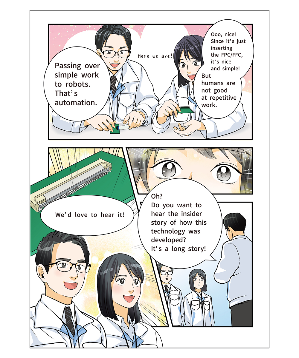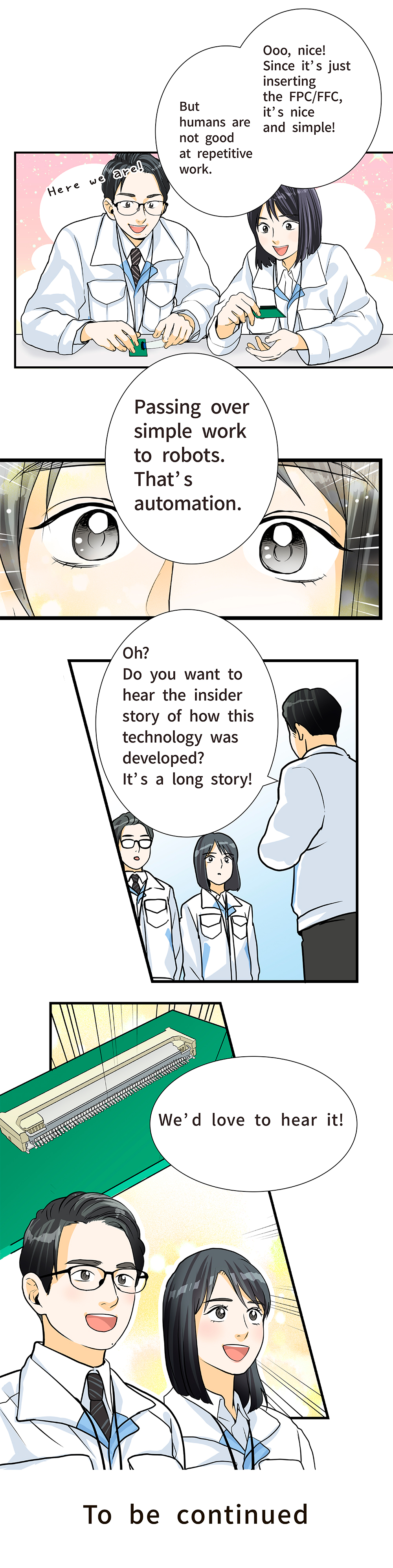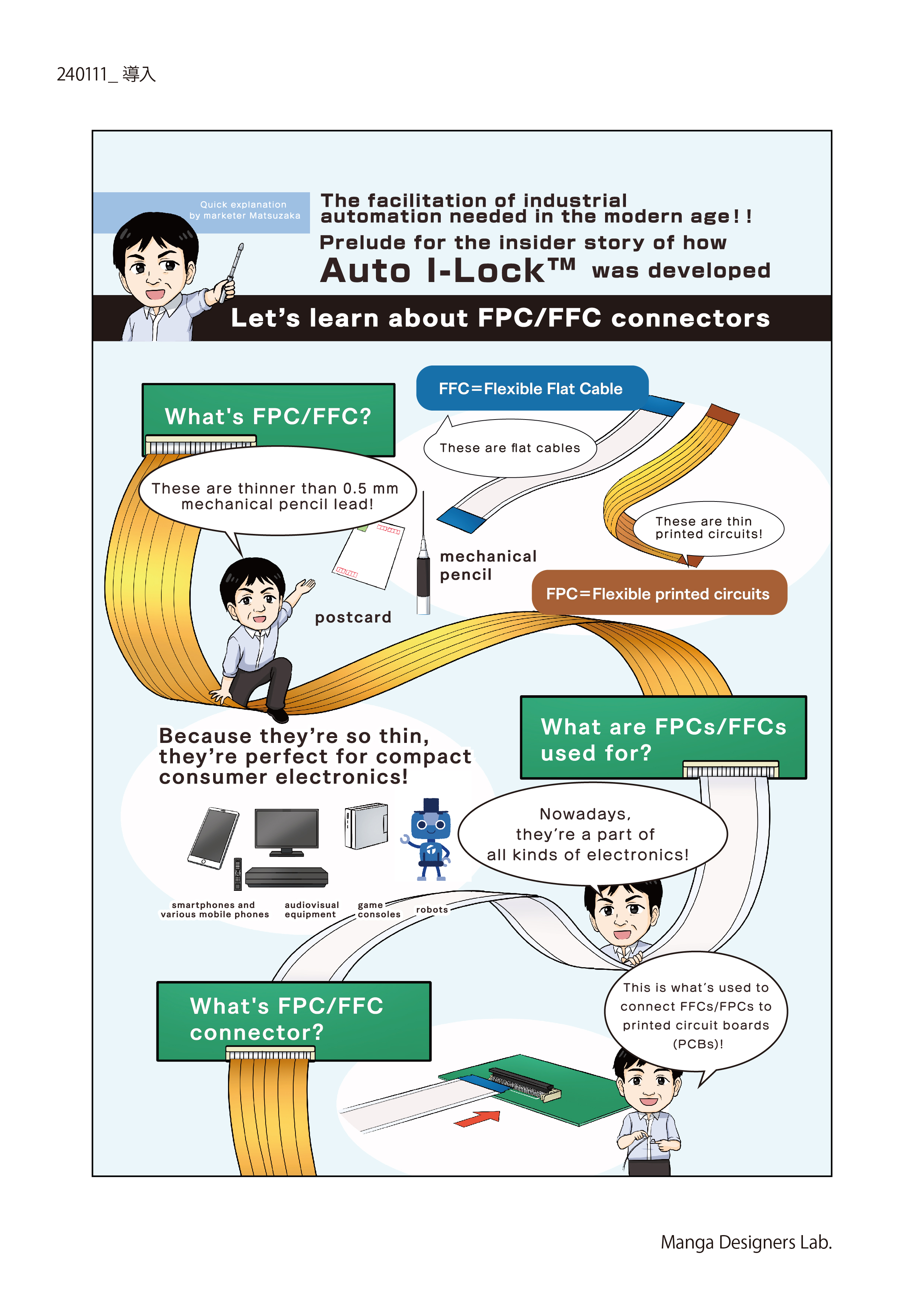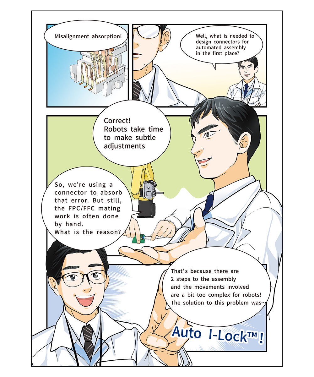 IRISO' FPC/FFC connector "Auto I-Lock structure" is a connector with a structure that automatically locks when an FPC/FFC card is inserted. It eliminates the need to open and close slider cover or cover, and the structure locks the FPC/FFC card as soon as it is inserted, reducing the risk of slanted insertion or incomplete Mating, improving work efficiency. Because it ensures reliable Mating, robotic assembly is possible even when using FPC/FFC cards.
