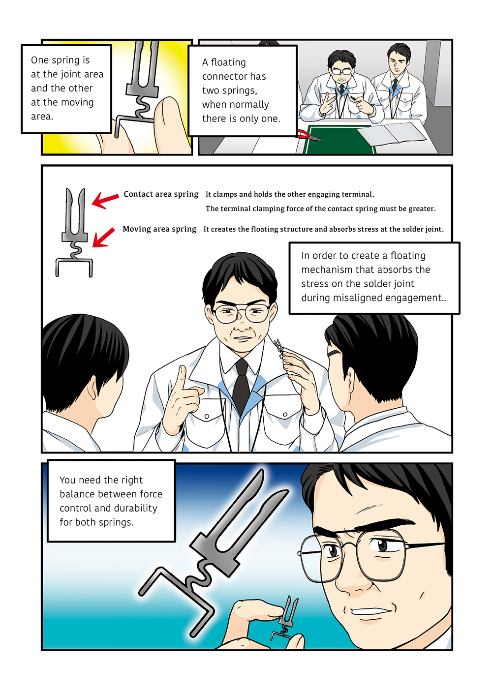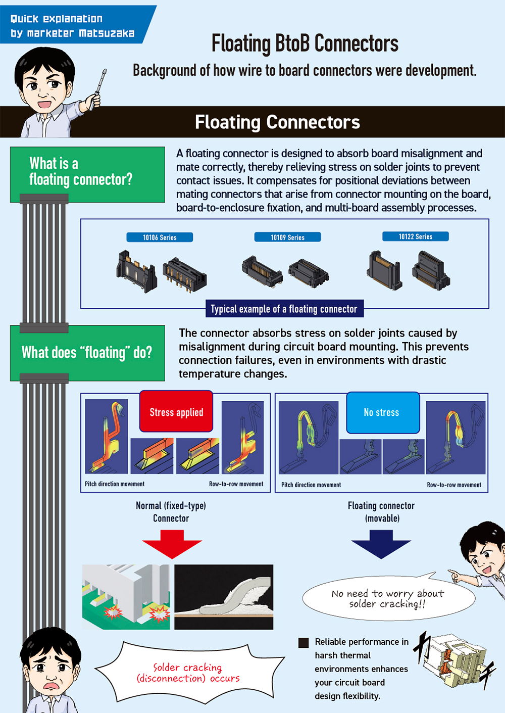 This is a 2.0mm pitch, Stacking connection Board to Board Connectors. It features Floating structure (Floating) structure, allowing for 0.5mm Floating in X Y direction. It has an effective Mating of 0.5mm in the Z direction. It can be connected to pin headers and supports a wide range of height adjustments.